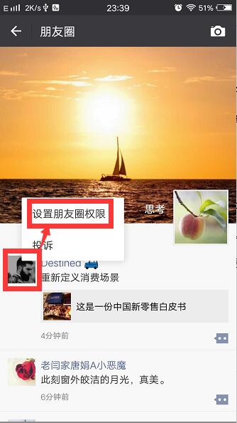 2、我们直接摁着发广告、刷屏的微信朋友图像,快些限制。常摁着微信图像,直接跳出“设置朋友圈权限”和“投诉”。